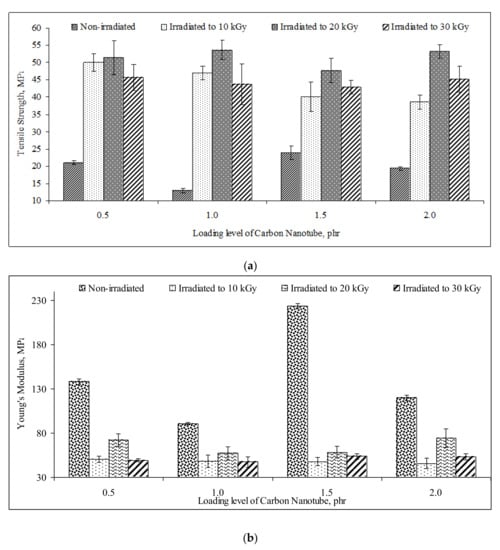 Effects of increasing electron beam irradiation dosages on (a) tensile strength and (b) Young’s modulus of polyvinyl alcohol (PVOH) nanocomposites added with various loading levels of carbon nanotubes (CNTs).