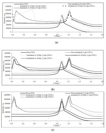 Effects of increasing loading level of carbon nanotubes (CNTs) on the 2 theta (2θ), d-spacing, and interchain separation of deflection peak (002) on XRD curves for non-irradiated and irradiated polyvinyl alcohol (PVOH) nanocomposites, as depicted in Figure 2.