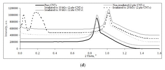 Effects of increasing loading level of carbon nanotubes (CNTs) on XRD curves for non-irradiated and irradiated polyvinyl alcohol (PVOH) nanocomposites. (a) 0.5 phr CNTs; (b) 1.0 phr CNTs; (c) 1.5 phr CNTs; (d) 2.0 phr CNTs.