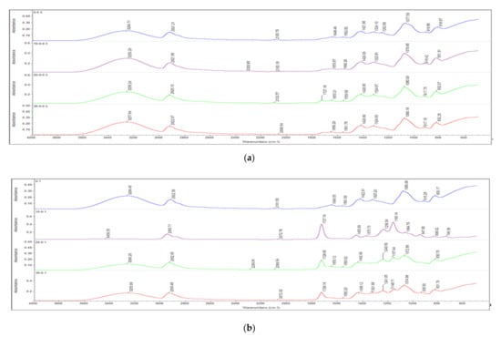 Effects of increasing electron beam irradiation dosages on FTIR spectrum of (a) 1.5 phr CNTs and (b) 2.0 phr CNTs added polyvinyl alcohol (PVOH) nanocomposites.