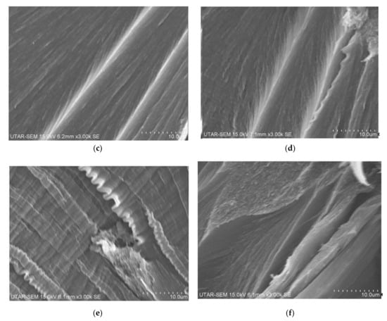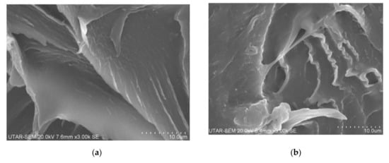 Figure 5 illustrates the fractured surface morphologies of PVOH/CNTs composites added with 0.5 and 2 phr (low and high) loading levels of carbon nanotubes when irradiated to irradiation dosages of 10 and 30 kGy. By referring to Figure 5a,b, the tearing effect can be clearly observed to occur on the fractured surface of 0.5 and 2 phr carbon nanotubes added PVOH/CNTs composites. The presence of tearing effect is mainly attributed to the elongation ability of polymer matrix of non-irradiated PVOH/CNTs composites under straining. However, the tearing effect on the fractured surface of 0.5 phr carbon nanotubes that added PVOH/CNTs composites was observed to be larger, more continuous, and less in amount when compared to the 2 phr carbon nanotubes added PVOH/CNTs composites. From Figure 5a, the smooth fractured surface of non-irradiated PVOH/CNTs composites, added with lower carbon nanotubes particles, indicates the good dispersion effect of carbon nanotubes particles in PVOH matrix at lower loading level of carbon nanotubes. At a higher amount of carbon nanotubes particles, the carbon nanotubes particles tended to agglomerate together into larger carbon nanotubes agglomerates particles as observed in Figure 5b. The agglomeration of carbon nanotube particles in the PVOH matrix has significantly weakened the interfacial adhesion effect between carbon nanotubes particles and PVOH matrix, and it has acted as stress concentration points in the polymer matrix during straining [11]. This further caused the applied straining stress unable to be evenly transferred from polymer matrix to agglomerates particles and tear the PVOH matrix that interfaced with the agglomerates particles of carbon nanotubes. Thus, the PVOH/CNTs composites, added with higher carbon nanotubes (2 phr), was found to pose less continuous and smaller tearing effect than the 0.5 phr carbon nanotubes added PVOH/CNTs composites. On the other hand, the tearing effect on the all PVOH/CNTs composites (0.5 and 2 phr) was found to disappear when subjected to electron beam irradiation dosage up to 10 kGy. Besides, the fractured surface of 10 kGy irradiated samples were also observed to be significantly more continuous and smoother than all non-irradiated samples. This indicates that the formation of crosslinking networks, induced by a low irradiation dosage of 10 kGy, has significantly extended the elongation ability of PVOH/CNTs composites by delaying the tearing effect of polymer matrix. However, the fractured surface of all PVOH/CNTs composites (0.5 and 2 phr) was found to breakdown without a significant elongation effect during straining. This observation indicates the application of electron beam irradiation dosage up to 30 kGy has severely degraded and embrittled the polymer matrix of all PVOH/CNTs composites.