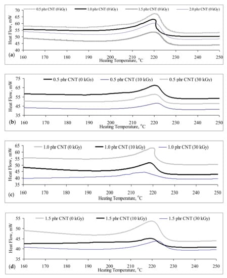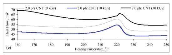 From Figure 6, a significant endothermic peak can be observed to occur on the DSC thermograms of all carbon nanotubes (CNT) added PVOH nanocomposites. The presence of this endothermic peak also indicates the melting state of all PVOH/CNT nanocomposites occurred at the temperature range from 210 to 230 °C. By observing the Figure 6a, the endothermic peak of all PVOH/CNT nanocomposites were significantly broadened when the loading level of CNT increased from 0.5 to 1.5 phr. This indicates that the increasing CNT amount from 0.5 to 1.5 phr has significantly disturbed the presence of hydrogen bonding in polymer matrix of PVOH/CNT nanocomposites by broadening the endothermic peak. This is attributed to the presence of CNT particles could reduce the hydrogen bonding in PVOH matrix by introducing the interaction bonding between the CNT particles and PVOH matrix. This can be further proved that the enthalpy of melting of non-irradiated PVOH/CNT nanocomposites was gradually increased with an increasing CNT amount, as tabulated in Table 3. This also indicates that the addition of CNT has significantly induced the required thermal energy to provide sufficient amount of kinetic energy by discharging the polymer molecules from the ordered crystallite structure [24]. Moreover, the melting endothermic peak with broader area might also attribute to enhancement of the arrangement crystallite structure with higher molecular weight. This indicates that the higher of CNT particles could effectively interact with PVOH chains by increasing the intermolecular bonding in the polymer matrix of PVOH nanocomposites [33]. As results, higher thermal energy is required to overcome the intermolecular bonding between CNT particles and PVOH matrix. The melting temperature of non-irradiated PVOH/CNT nanocomposites was also found to slightly increase with increasing of CNT loading level, as shown in Table 3. However, the enthalpy of melting of non-irradiated PVOH/CNT nanocomposites was observed to marginally decrease when the loading level of CNT particles increased from 1.5 to 2 phr. This might be due to the agglomeration of CNT particles at higher loading level could disrupt and hinder the ordered chains arrangement structure in PVOH matrix [24]. Thus, the required thermal energy to overcome the intermolecular bonding of 2 phr CNT added PVOH nanocomposites has been significantly reduced.
