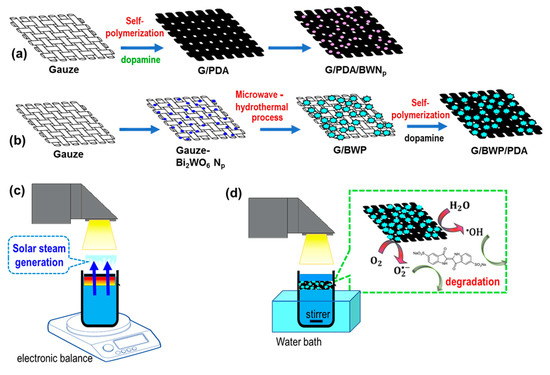 Procedures of the formation of Bi2WO6-polydopamine decorated gauze (a) G/PDA/BWNp (gauze/polydopamine/Bi2WO6 nanoparticles) (b) G/BWP/PDA (gauze/Bi2WO6 nanoplates/polydopamine) samples, schematic illustrations of the setup for (c) solar steam generation test (d) photocatalytic degradation test.