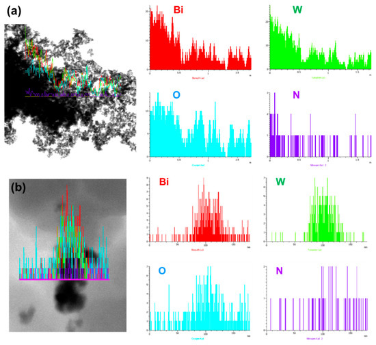The TEM energy-dispersive X-ray (EDX) spectrum of a line scan is presented in Figure 3a to investigate the elemental distribution for the powder scratched from the G/BWP/PDA composite sample. The Bi, W, O, and N elements are found in the G/BWP/PDA sample. The elements of Bi, W, and O indicate the existence of Bi2WO6. The N element originates from dopamine due to the successful polymerization of dopamine on the fabrics. The signals of the Bi, W, O, and N elements are higher near the center of the line, indicating that the plate-like sample is Bi2WO6, and polydopamine is distributed well near Bi2WO6. Similar results were observed for the powder scratched from the G/PDA/BWNp composite sample (Figure 3b).