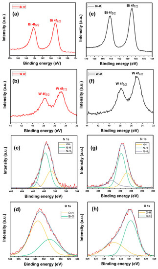 The XPS analysis of G/BWP/PDA sample was measured to analyze its oxidation state and chemical composition. Figure 4 shows the XPS (a) Bi 4f (b) W 4f (c) N 1s (d) O 1s spectra of G/BWP/PDA. The Bi 4f peaks of G/BWP/PDA at 158.9 and 164.2 eV can be assigned to Bi 4f7/2 and Bi 4f5/2, indicating the Bi3+ of Bi2WO6. The W 4f peaks of G/BWP/PDA at 37.8 and 34.7 eV are attributed to W 4f5/2 and W 4f7/2, respectively, which are related to W6+ of Bi2WO6 [61,62]. The N 1s peak is deconvoluted into three peaks (Figure 4c). That peaks at 401.5, 399.8, and 398.7 eV can be attributed to primary amine (R–NH2), secondary amine (R1-NH-R2), and tertiary amine (=N-R) groups, respectively [63,64]. The results are related to the chemical structures of polydopamine, possible intermediate species, and dopamine monomer [65]. The primary amine is related to dopamine. The secondary amine can be assigned to the intermediate species or polydopamine, while the tertiary amine can be attributed to tautomeric species of the intermediates. The O 1s spectrum of G/BWP/PDA was deconvoluted into two peaks. The peaks at 531.3 and 532.7 eV are assigned to Bi–O, and O–H, respectively. These results support the formation of Bi2WO6 and polydopamine on the sample. Figure 4e–h present the XPS Bi 4f, W 4f, N 1s, and O 1s spectra of G/PDA/BWNp, respectively. The results of the G/PDA/BWNp sample were similar to those of G/BWP/PDA, except that the Bi–O peak was higher than the O–H peak in the O 1s spectrum.