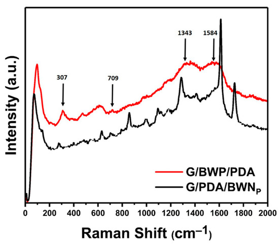 The surface chemistry of G/BWP/PDA and G/PDA/BWNP was analyzed by the Raman spectra (Figure 5). The peak at 709 cm−1 is associated with the asymmetric stretching mode of WO6 octahedra for the vibrations of equatorial oxygen atoms within layers. The peak at 307 cm−1 was related to the simultaneous translational movement of Bi3+ and the bending of WO6 octahedra [66,67]. Besides, two broad peaks at 1343 and 1584 cm−1 were attributed to the catechol stretching vibration and deformation from the chains of polydopamine. Similar results were reported in the literature [68,69,70,71]. These peaks support the existence of polydopamine and Bi2WO6 on G/BWP/PDA sample. Similar peaks were found for the G/PDA/BWNP sample.