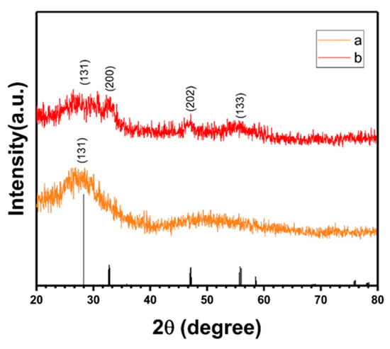 Figure 7 presents the XRD spectra of G/PDA/BWNP and G/BWP/PDA. A broad diffraction peak of G/PDA/BWNP photocatalyst at 2θ = 28.4° is assigned to the (131) plane of the orthorhombic phase of Bi2WO6 (JCPDS#79-2381). There is a wide peak at around 2θ = 50°. The broad XRD diffraction peaks indicated weak crystallinity of the G/PDA/BWNP photocatalyst. The main characteristic diffraction peaks of the G/BWP/PDA photocatalyst observed at 2θ = 28.4°, 32.8°, 47.2°, and 55.7° are attributed to the (131), (200), (202), and (133) planes of the orthorhombic phase of Bi2WO6 (JCPDS#79-2381), respectively. These were consistent with the results reported in other literature [72,73], indicating the formation of Bi2WO6 in G/BWP/PDA.