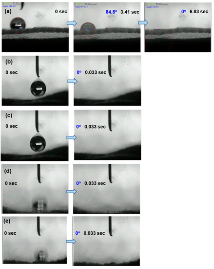 Dynamic contact angles of water droplets on (a) gauze (b) G/PDA (c) G/BWP (d) G/BWP/PDA (e) G/PDA/BWNP.