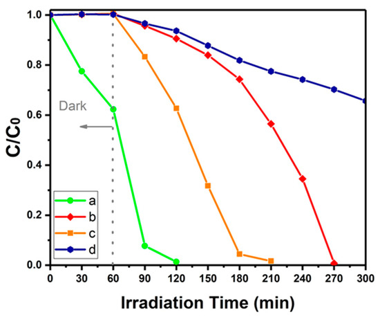 Photodegradation of indigo carmine (60 ppm) under circulating water conditions by (a) G/BWP (b) G/BWP/PDA (c) G/PDA/BWNP (d) without photocatalyst (blank).