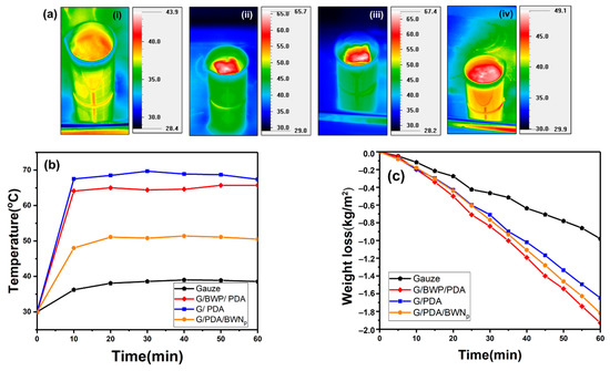 (a) Bulk water temperature distribution of (i) gauze (ii) G/BWP/PDA (iii) G/PDA (iv) G/PDA/BWNP, and (b) surface temperature profiles over time (c) mass loss of water over time by gauze, G/PDA, G/BWP/PDA, G/PDA/BWNP after simulated solar illumination at 1 kW m−2 (1 sun).