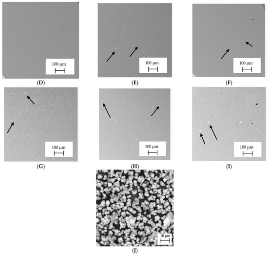Results of SEM–BSE cross-area observations. Black arrows indicate exemplary particles of additives. (A–I): specific type of material analyzed. (J)—additive used in material E.