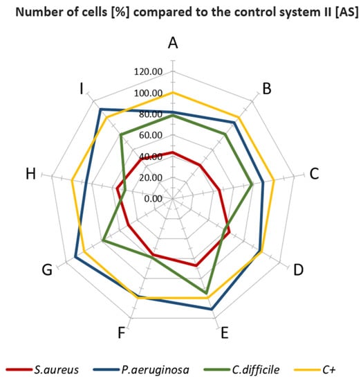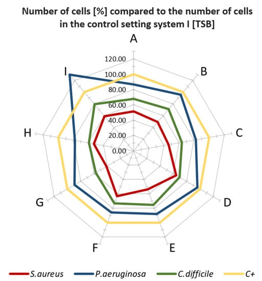 In the case of P. aeruginosa, incubated in the medium-I, the growth of bacterial cells was higher than in the control setting. The most extraordinary stimulation was observed for G, E, and I material, where the number of bacteria compared to the control was over 100%. An insignificant decrease of cell number (5–20%) for F, A, D or C, and H was observed. A higher decrease of S. aureus cell number (in comparison with P. aeruginosa) was detected (30–60%) for the aforementioned materials. In turn, C. difficile displayed differentiated susceptibility to applied materials (5–60% reduction rate, dependent on surface, Figure 3). The highest reduction for species above was recorded towards A-material (60%).