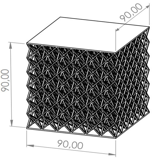 Three different unit cell sizes have been studied: 1.5 cm, 3 cm, 4.5 cm. All the unit cell sizes are equal in x-y-z directions, where x-y are directions in the plane, and y-z is the thickness direction. Each unit cell is a cube of 1.5 mm × 1.5 mm × 1.5 mm, 3 mm × 3 mm × 3 mm, 4.5 mm × 4.5 mm × 4.5 mm, respectively (Table 1). According to the lattice unit size, the number of unit cells is repeated to maintain the original dimensions of the structure of 9 cm × 9 cm × 9 cm. This mean that for a size of 1.5 cm the structure is 6 × 6 × 6 unit cells, for 3 cm it is 3 × 3 × 3 unit cells, and for 4.5 it is 2 × 2 × 2 unit cells (Table 1). In each of the unit sizes the thickness of the walls is kept constant at a size of 1.20 mm thick.