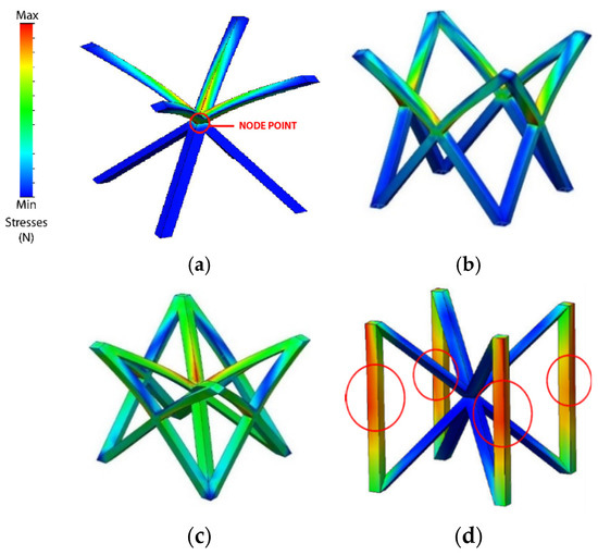 Compression stress analysis of the different cell topologies; (a) BCC; (b) FCC; (c) FBCC; (d) BCCz.