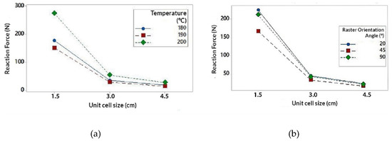 The interaction of the Unit size (U) parameter is represented in Figure 6 (extracted from the interaction graph of Figure A4 in Appendix B). It is observed that U exerts a great influence on the RF value. In the same way, RF value tends to decrease as U increases. One factor to highlight is that the RF value decreases much more notably when the U varies from 1.5 cm to 3 cm (decreases by 80%) compared to when U varies from 3 cm to 4.5 cm (decreases by 47%). This decrease in the RF value can be justified by the porosity of the structure. For higher values of U, the specimens are much more porous and have less material volume with respect to the total volume of the structure (Table 1). Similarly, when the value of U is higher, the number of cells that are repeated to form the structure, is reduced by 50% for a value of U = 3 cm, and 30% for U = 4.5 cm (With respect to U = 3 cm). This would explain why the value of RF varies much more notably when U varies from 1.5 cm to 3 cm and vice versa.