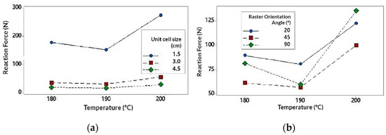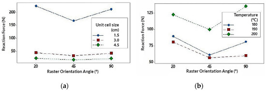 The interaction of the Raster Angle Orientation (R) parameter is represented In Figure 8 (extracted from the interaction graph of Figure A4). According to the interaction graph, the highest RF values have been obtained for the orientation R = 20°, followed by R = 90° and R = 45°. According to [58], the mechanical resistance of the specimens according to the different angles, can be influenced by the mechanism of fusion of the filling material. Similarly the structural behavior can be reduced by the formation of inclusions and internal defects such as bubbles within the the layers [58]. It is notable that the values of RF decrease for R = 45°. This may be due to the fact that, for this orientation the production of inclusions can develop more predominantly than for other orientations [58]. This fact would negatively affect the mechanical behavior. Referring to the aforementioned, this mechanism could be the reason why the values obtained for T = 190 °C were lower than those obtained for T = 180 °C.