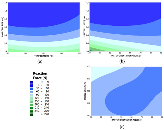 FBCC contour plot; (a) Unit cell size (U) vs. Temperature (T); (b) Unit cell size (U) vs. Raster Orientation Angle (R); (c) Temperature (T) vs. Raster Orientation Angle (R).