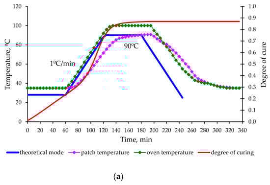 Among the parameters of the moulding mode, significant effect on the stress–strain behaviour is exerted, first of all, by curing temperature (), heating rate () and cooling rate () of the structure under repair. Holding time at determines the degree of curing of the repair patch and affects not so much the stress–strain behaviour, but physico-mechanical characteristics of the PCM.