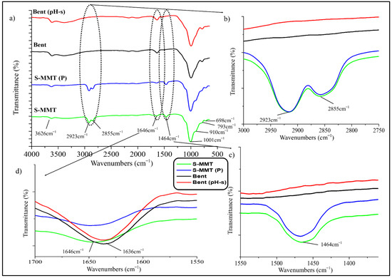 FTIR spectra of the pristine S-MMT, physically treated S-MMT (S-MMT(P)), pristine Bent and physically treated Bent (Bent(pH-s)) in a scan range (a) 4000 cm−1–500 cm−1; (b) 3000 cm−1–2750 cm−1; (c) 1550 cm−1–1360 cm−1; (d) 1700 cm−1–1550 cm−1.