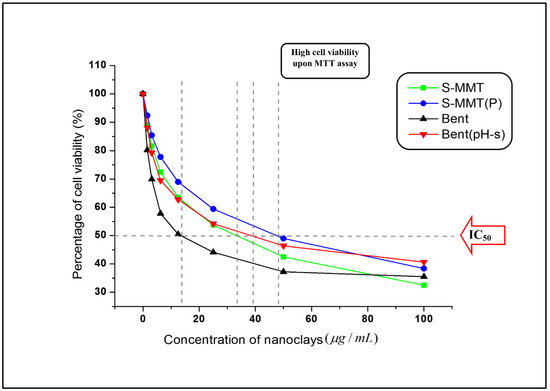 Results indicate that both nanoclays (S-MMT and Bent) cause cell death in a concentration-dependent manner [37,38]. However, types of nanoclay and physical treatment affect the inhibitory concentration (IC50) value, which refers to the concentration of the nanoclay suspension required to kill 50% of the living cells. The testing rules for the in vitro cytotoxicity determination suggested that the cytotoxicity potential towards the cell culture can be generated when the IC50 of the test agents is lower than 30 μg/mL [28,29]. Based on Figure 3, we can conclude that except for Bent, all the samples would probably lead to mild cytotoxicity against the fibroblast cell line as all the IC50 values obtained were above 30 μg/mL [39,40]. Interestingly, the percentage of cell viability was higher in the S-MMT(P) and Bent(pH-s) as compared to the S-MMT and Bent, respectively, meaning that the cell survival was enhanced by the physical treatment processes of the nanoclays. Particularly for Bent, the IC50 value increased drastically from 13.79 μg/mL (Bent) to 39.28 μg/mL (Bent(pH-s)), suggesting that the original form of Bent with a fairly high cytotoxicity level reduced to a mild cytotoxicity level only. On the other hand, the IC50 of the S-MMT was enhanced from 33.54 μg/mL to 48.00 μg/mL (S-MMT (P)) after the nanoclay underwent the physical treatment.