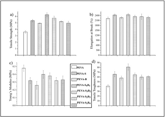 The tensile properties of the neat PEVA, PEVA nanocomposites, and PEVA-DCN nanocomposite were analyzed. Figure 4a–d compare the tensile strength (TS), elongation at break (EB), Young’s modulus (YM), and tensile toughness (TT) of the materials, respectively. The mean values of all these data are tabulated in Table 2.