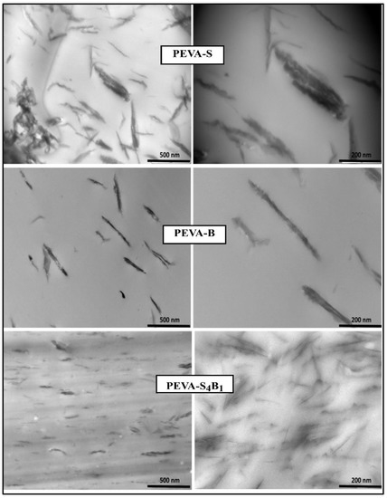 TEM micrograph of PEVA nanocomposites (PEVA-S and PEVA-B) and PEVA-DCN nanocomposites (PEVA-S4B1).