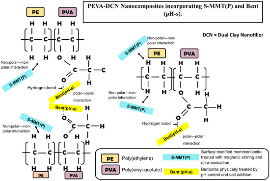 Interactions of dual nanofillers (S-MMT(P)): Bent(pH-s) with PE and PVA phase of PEVA copolymer chains.