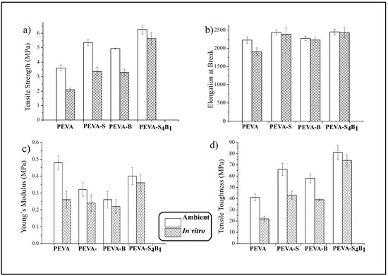 The neat PEVA, PEVA nanocomposites (PEVA-B and PEVA-S), and PEVA-DCN nanocomposite (PEVA-S4B1) samples were subjected to in vitro conditions for 3 months before being subjected to tensile test and surface degradation analysis for the biostability evaluation. The in vitro treatment involved the immersion of samples under phosphate buffered saline (PBS) solution at 37 °C as the simulated body fluid. The in vitro tensile testing was carried out under similar experimental parameters/conditions as the ambient tensile tests. The data (before and after in vitro exposure) were compared through the results of the in vitro tensile test and surface morphology captured by SEM to detect degradation effects on the samples after long in vitro exposure.