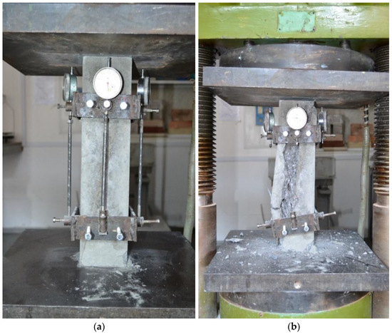 Tests of prisms for axial compression and axial tension were carried out at a constant rate of deformation to obtain the strength and deformation characteristics of concrete and its full deformation diagrams “σ–ε” with descending branches. The measurements of the concrete deformations of the test prisms were carried out by a chain of strain gauges with a side length of 50 mm and dial indicators with a graduation value of 0.001 mm. Axial compression and axial tension tests were carried out following the requirements of GOST 24,452 “Concretes. Methods of prismatic, compressive strength, modulus of elasticity and Poisson’s ratio determination” (interstate standard) [35].
