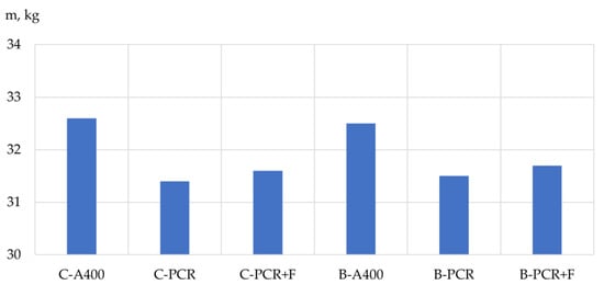 Dependence of the mass of the prototype columns and specimen beams on the type of reinforcement used: C-A400 is the sample column reinforced with steel reinforcement of class A400; C-PCR is a sample column reinforced with polymer composite reinforcement; C-PCR+F is a sample column reinforced with polymer composite reinforcement and glass fiber; B-A400 is a sample beam reinforced with steel reinforcement class A400; B-PCR is a sample beam reinforced with polymer composite reinforcement; B-PCR+F is a sample beam reinforced with polymer composite reinforcement and glass fiber.