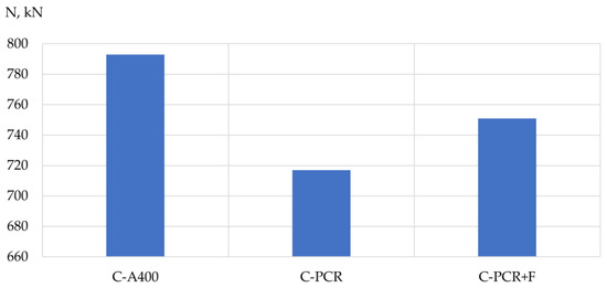 Dependence of the bearing capacity of the column specimens on the type of reinforcement used: C-A400 is a column specimen reinforced with A400 steel reinforcement; C-PCR is a column specimen reinforced with polymer composite reinforcement; C-PCR+F is a column specimen reinforced with polymer composite reinforcement and glass fiber.