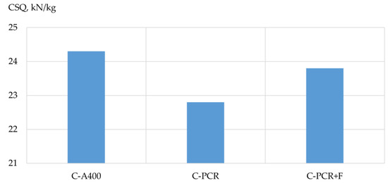 Dependence of the structural quality factor of the sample columns on the type of reinforcement used: C-A400 is a sample column reinforced with steel reinforcement of class A400; C-PCR is a sample-column reinforced with polymer composite reinforcement; C-PCR+F is a sample-column reinforced with polymer composite reinforcement and glass fiber.