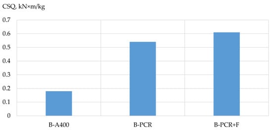 Dependence of the structural quality factor of sample beams on the type of reinforcement used: B-A400 is a sample beam reinforced with steel reinforcement of class A400; B-PCR is a sample beam reinforced with polymer composite reinforcement; B-PCR+F is a sample beam reinforced with polymer composite reinforcement and glass fiber.