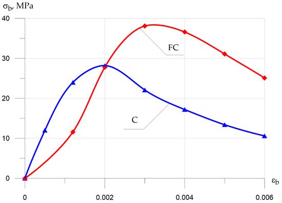 Stress–strain diagram for concrete compression (C, concrete; FC, fiber concrete).