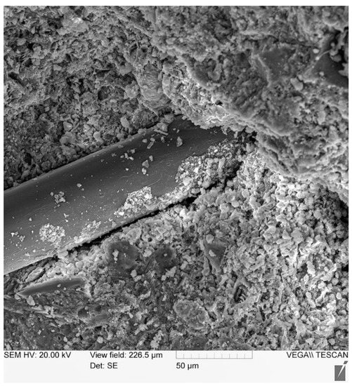 The fiber in this case is a filler and the cement stone is a matrix. The photograph clearly shows the contact zone between them. At the micro-level, the fiber is also exposed to the adhesion of particles of the hydration products of the cement stone, which suggests a good degree of adhesion between the fiber and the cement stone. Thus, the fiber, which has both the function of a damper and imparting a soft tough character of destruction, is also a fairly integrated component that is not rejected by the cement stone, despite its foreign character in the concrete body, and it confirms a high level of adhesion as well as anchoring in the concrete body.