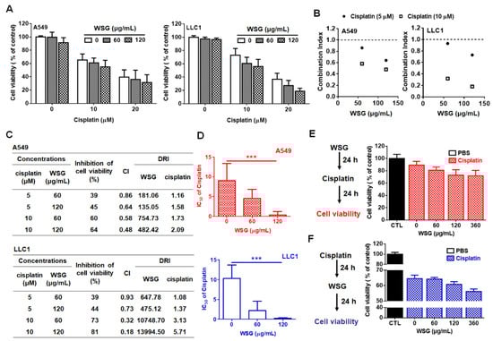 WSG enhances the cytotoxic effects of cisplatin on A549 and LLC1 cells. (A) A549 and LLC1 cells were subjected to 24 h combination treatment using different concentrations of WSG and cisplatin. A crystal violet staining assay was conducted for cell viability examination. Each sample in the combination treatment group was normalized against each untreated control. (B,C) CI and DRI of the combination treatment in the A549 and LLC1 cells, determined using CompuSyn software. (D) WSG reduced the IC50 of cisplatin in A549 and LLC1 cells. The IC50 values of cisplatin were measured using CompuSyn Software. Significant differences between the treatment and control groups are presented (*** p < 0.001). (E) Left: the schematic design for the in vitro cell viability assay of WSG (0–360 μg/mL)→cisplatin (5 μM) sequential treatment. Right: The viability of the cells was determined by using the crystal violet assay. (F) Left: the schematic design for the in vitro cell viability assay of cisplatin (5 μM)→WSG (0–360 μg/mL) sequential treatment. Right: The viability of the cells was determined by using the crystal violet assay. Each sample in the combination treatment group was normalized against each untreated control. Error bars indicated SD.