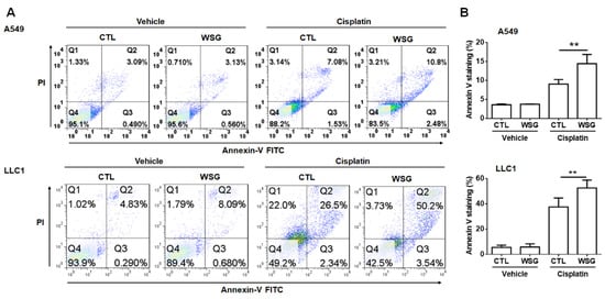 To further examine these synergistic cytotoxic effects, we used an annexin V–FITC/PI staining kit to test whether WSG enhanced cisplatin-induced cell death. As shown in Figure 2, apoptosis occurred in 32.7–45.7% of the A549 cells co-treated with cisplatin (10 μM) and WSG (120 μg/mL). The corresponding rate among the LLC1 cells ranged from 27.6% to 51.8%. These results suggest that the combination of cisplatin and WSG was much more effective in inducing cell death than cisplatin alone. In essence, the in vitro experiments demonstrated that the combination of cisplatin and WSG exerted reliable, synergistic, and cytotoxic effects, inducing cell death in the lung cancer cells.