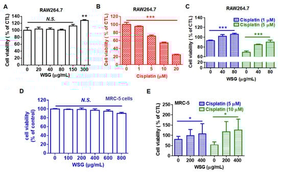 WSG reduces cisplatin-induced cytotoxic effects on RAW 264.7 and MRC-5 cells. (A) RAW 264.7 murine macrophages were subjected to 24 h treatment with various concentrations (0–300 μg/mL) of WSG. (B) RAW 264.7 cells were subjected to treatment with various concentrations (0–20 μM) of cisplatin for 24 h. (C) RAW 264.7 cells were subjected to 24 h treatment with both WSG (40 and 80 μg/mL) and cisplatin (1 and 5 μM). (D) MCR-5 cells were subjected to 48 h treatment with various concentrations (0–800 μg/mL) of WSG, and their viability was assessed through crystal violet staining. WSG treatment group data were normalized for comparison with an untreated control. (E) MRC-5 fibroblasts were subjected to 48 h treatment with a combination of WSG (200 and 400 μg/mL) and cisplatin (5 and 10 μM). A crystal violet assay was performed for cell viability examination. Treatment groups were normalized for comparison with an untreated control. Data are presented as means ± standard deviations. Significant differences between the treatment and control groups are presented (* p < 0.05, ** p < 0.01, *** p < 0.001).