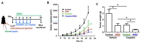 Co-treatment with WSG and cisplatin suppresses lung tumor growth in mice bearing LLC1 cells. (A) Experimental schematic. LLC1-bearing mice (n = 5 in each group) were intraperitoneally injected with cisplatin and WSG. (B) Tumor volume was monitored for the indicated times. (C) Tumor weights were determined after each intervention. The bars represent means ± standard deviations. Significant differences between the treatment and control groups are presented (* p < 0.05, *** p < 0.001).
