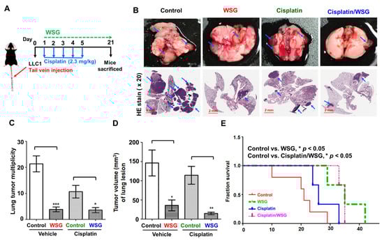 Co-treatment with WSG and cisplatin suppresses tumorigenesis in the lung tissues of mice injected with LLC1 cells. (A) Experimental schematic. LLC1 cells were injected through the lateral tail veins of the mice (n = 5). The LLC1-bearing mice were intraperitoneally injected with cisplatin and WSG. (B) At the end of the treatment, lung tissue was collected. One of five tissue samples is presented. As indicated by the blue arrows, tumor lesions were observed on the surface of the lung tissues. Lower panels of the lung sections under H&E staining (20× magnification). Bar scale: 2 mm. (C) Tumors (nodules) in the lung lesions. (D) Tumor volume (mm3) of the lung lesions. Each bar represents the mean ± standard deviation. Significant differences between the treatment and control groups are presented (* p < 0.05, ** p < 0.01, *** p < 0.001). (E) Combination treatment increased the survival rate of LLC1-bearing mice (n = 8).