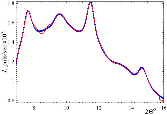 As a result, two groups of diffraction peaks corresponding to two systems of crystallites with interplanar spacings, shown in Table 1, were detected. The resulting baseline and the result of its subtraction from the experimental data are shown in Figure 3. The angular scale is expressed in the scattering vector moduli
