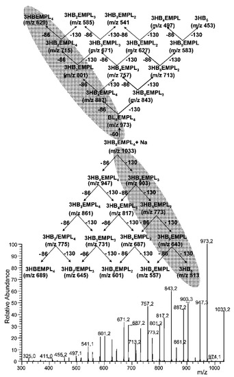 ESI-MS/MS spectrum of the sodiated precursor ion [3-HB5/EMPL4 + Na]+, m/z 1033, selected from the simple ESI mass spectrum (series A) of a random copolyester sample. Theoretical fragmentation pathway of the selected ion. The part of the scheme indicated in gray shows the product ions formed from BBL-β-ethoxymethyl-β-propiolactone diblock copolyester molecular ions at m/z 1033. (Reprinted with permission from Ref. [33]. Copyright 2009, American Chemical Society).