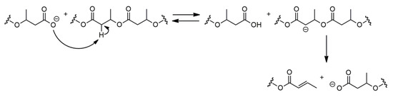 A novel intermolecular degradation reaction of poly(BBL) and its homologs was discovered and described, and its mechanism was proposed. The degradation reaction, which takes place at moderate temperatures, follows the intermolecular E1cB mechanism and is “initiated” by factors capable of abstracting a proton at the C2 carbon of the polyester chain (Scheme 6) [52,53].