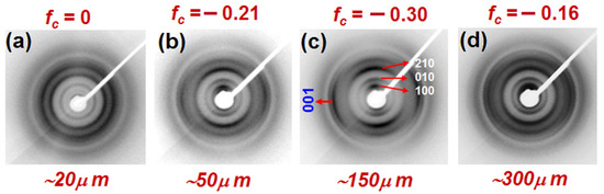 For patterns of thicker films (from 50 μm up to 300 μm, Figure 1b–d), all hk0 reflections are present as arcs centered on the meridian. This clearly indicates, as already described for films of thickness of 50–90 μm [21,40,50], the occurrence of c⊥ orientation. Rather surprisingly, the thinner film (20 μm, Figure 1a) only exhibits diffraction rings, which clearly indicate absence of crystalline phase orientation.