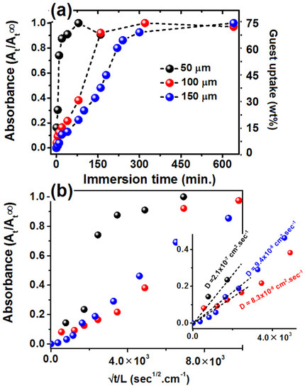 Kinetics of BE guest sorption (curves a and a’) and kinetics of film thickening (curves b and b’), for films with thickness of 100 μm and 150 μm, are compared in Figure 5A,B, respectively. It is apparent that guest uptake and thickness increase exhibit similar kinetics, with similar sigmoid shapes.