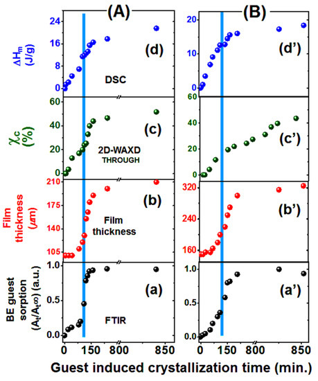 Kinetics of phenomena associated with room-temperature guest-induced crystallization of amorphous PPO films, with thickness of 100 μm (A) and 150 μm (B): (a,a’) BE guest sorption; (b,b’) film thickness; (c,c’) crystallinity index by WAXD (χc); (d,d’) melting enthalpy (ΔHm). The blue vertical bar indicates the time of inflection of the S-shaped curve describing guest sorption, which can be taken as a measure of the time needed for film plasticization.