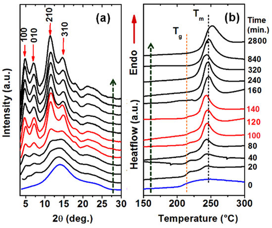 2D-WAXD patterns (as taken with the X-ray beam perpendicular to the film plane, THROUGH patterns) of amorphous PPO films, after crystallization induced by BE guest sorption/desorption, only exhibit diffraction rings [21]. Radial diffraction profiles of these 2D-WAXD THROUGH patterns, for a 100 μm film, after different sorption times (in the range 20–2800 min) are shown in Figure 6a. It is clearly apparent that, as a consequence of sorption, diffraction peaks typical of the NC α form (e.g., 100, 010, 210 and 310) [35,36] appear and progressively increase their intensity. Crystallinity indexes (χc) as evaluated on the basis of the WAXD THROUGH patterns for 100 μm and 150 μm films are collected in the third column of Table 1 and Table 2 and plotted in curves c and c’ of Figure 5A,B, respectively.