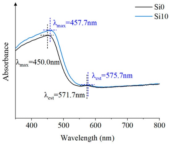 The light energy has a great influence on the discharge behavior of the material. Ultraviolet-visible spectroscopy can test the absorption characteristics of light energy and characterize the charge transfer complexation. The transmittance mode of Shimadzu UV-2600 ultraviolet and visible spectrophotometer (UV-Vis) can be directly used to test the absorbance of the film. The wavelength range of the test was 300–650 nm. According to the Ultraviolet-visible spectroscopy of Figure 2 in the wavelength range of 350–800 nm, the spectral characteristics can be characterized by the peak wavelength and the maximum absorption wavelength. Among them, the peak wavelength of Si10 is larger, and the absorption of Si10 is red shifted from the maximum absorption wavelength. After the addition of SiO2 nanoparticles, the maximum absorption wavelength in the near-UV region and the visible region moves to the long wave direction, namely, the red shift occurs. This indicates that after the introduction of SiO2, SiO2 is more likely to absorb light energy, easily form intermolecular electron cloud conjugation, increase the charge transfer complexation of polyimide, and enhance the intermolecular force of the material to improve the compactness and discharge tolerance of the composite film. For polymers, the red shift of the curve also indicates that the increase of the conjugated system improves the compactness and regularity of the materials, which will effectively hinder the movement of carriers, delay the formation of conductive channels, and be more difficult to form electronic collapse, thereby improving the insulation performance [12]. Therefore, the overall average discharge amplitude and discharge times per unit time of Si10 are lower, with the less energy collected by the plate electrode. By contrast, the energy collected by the Si0 plate electrode is the most.