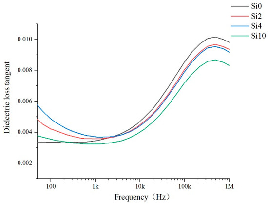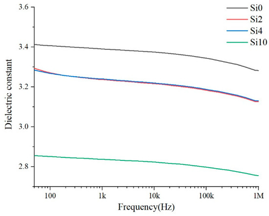 The dielectric properties of the materials characterize the polarization properties of polymer materials and the loss under alternating electric field. More heat is generated under high-frequency stress, which affects the high-frequency surface discharge life. The dielectric properties of the samples Si0, Si2, Si4 and Si10 are tested and the relative permittivity and dielectric loss tangent values are shown in Figure 10 and Figure 11.