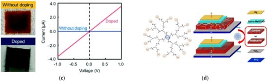 Dendrimer-based systems act as materials for (a) photocurrent generation, (b) sensor food spoilage detection, (c) semiconducting devices, and (d) enhancing the power conversion efficiency of solar cells. Reprinted with permission from [] Copyright 2019 Springer; [] Copyright 2021 American Chemical Society; [] Copyright 2020 Royal Society of Chemistry; [] Copyright 2021 Springer.